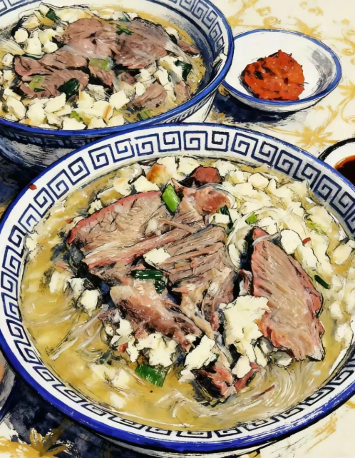 轉而向西,踏入西北遼闊的土地,秦腔的高亢嘹亮,正與當地飲食的雄渾厚重相得益彰。一聲發自肺腑的“嘹咋咧”!喊得酣暢淋漓,其豪邁的氣魄,猶如將掰好的饦饦饃浸入滾沸的羊肉湯中,粗獷的外表下,瞬間吸飽了滾燙鮮美的精華,吃起來是那般直接而痛快。這方言的力度與食物的熱辣濃郁交織在一起,在粗糲與淳樸之中,迸發出最為熾熱的人間煙火氣。