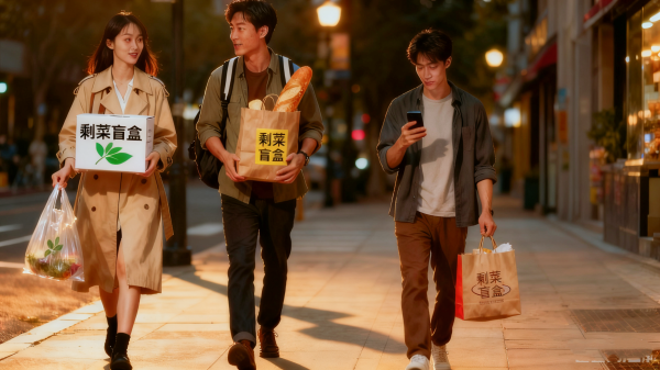凌晨兩點,一家高檔烘焙坊里,店員將當天未售完的面包小心翼翼地打包進紙袋,貼上密封條。幾小時后,這些食品會以“剩菜盲盒”的形式出現在附近上班族的手中。