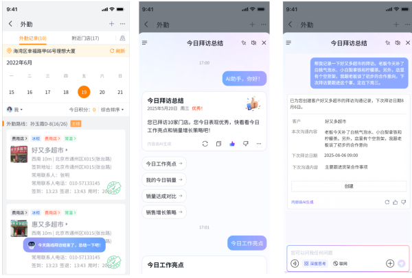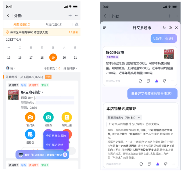 場景案例:小王今日門店拜訪結束,他打開“AI訪銷大腦”,準備對今日的工作做個快速總結和記錄。“幫我記錄一下好又多超市的拜訪情況。老板今天補了白桃氣泡水、小白梨拿鐵和檸檬茶。另外,店里有個空貨架,我跟老板談了初步的合作意向,下次拜訪要跟進這個事,定在下周三。”